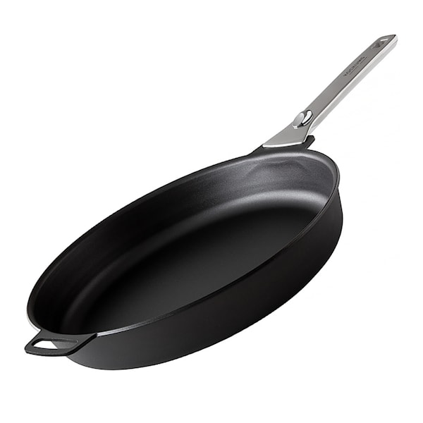 Med ett innovativt avtagbart handtag, enkelt monterbart med ett smidigt tumgrepp minimeras pannans utrymmeskrav på spisen, i ugnen och vid matbordet. Den blir också enkelt att stapla och förvara utan trassel.