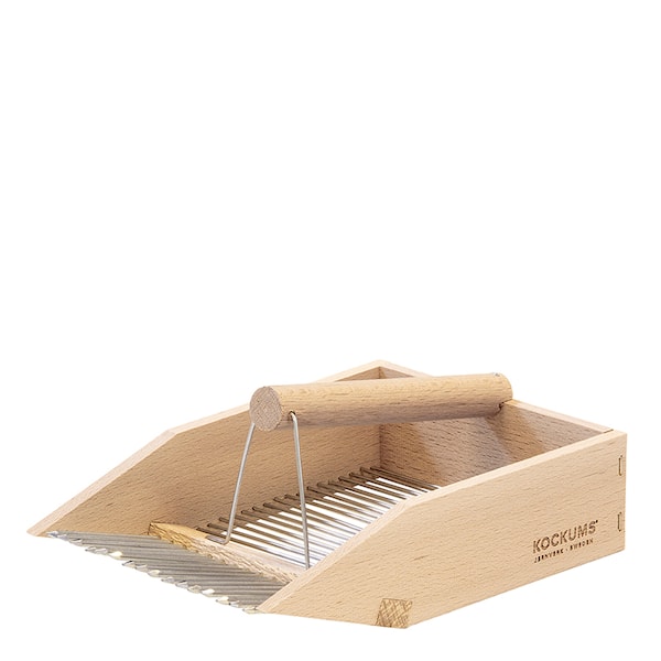 Bärplockare i obehandlat bokträ. Ett smidigt och lätthanterat redskap för plockning av blåbär, lingon och andra vilda bär. Blad och skräp faller ut genom bärplockarens gallerbotten. Den naturliga variationen i träet gör varje bärplockare unik.