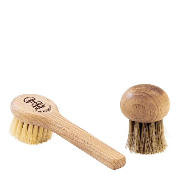 Svampborstar i bokträ med ett klassiskt formspråk. I setet ingår en borste med rundat grepp och en med ett längre skaft. För att behålla mest smak i färsk svamp ska jord och smuts helst borstas och skäras bort. Båda borstarna har mjuk tagelborst som rengör effektivt utan att svampen skadas. Den naturliga variationen i träet gör varje borste unik.