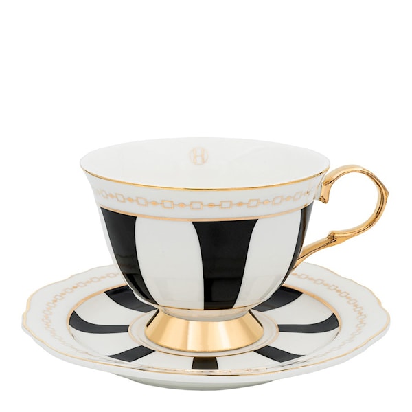 Kopp med Fat 22 cl Strisce Nero Svart/Vit från Hilke Collection är del ur en samling lyxiga porslinskoppar med tillhörande fat, alla med elegant mönster i guld. Alla koppar har samma modell men färgsättningen och mönstret skiljer dom åt, antingen väljer du alla med samma mönster eller mixar och matchar för att skapa en härlig effekt. Oavsett kan vi lova dig att det kommer bli en glamorös stund nästa gång du ska njuta av en kopp te eller kaffe i denna lyxiga servis.