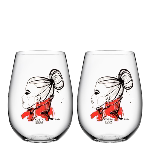 2-pack tumblerglas ur serien All About You, formgiven av Sara Woodrow för Kosta Boda. Sara Woodrow är konstär och har hämtat sin inspiration för motiven ur modevärlden. Matcha gärna med andra glas ur samma serie för att skapa en färgsprakande dukning. Motivet på detta glas i rött heter "Want You".