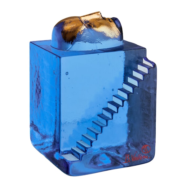 Fortress Man BV AC-25 från Kosta Boda visar Bertil Valliens förmåga att skapa konst där människans form möter materialets karaktär. Skulpturen är tillverkad av blått degelglas som formas med stor precision i en grafitform. Huvudet är handmålat i guld, och skulpturen färdigställs därefter av glasmästarna i hyttan. Resultatet är ett starkt visuellt uttryck där form, färg och textur samspelar och skapar en känsla av mystik och historia.