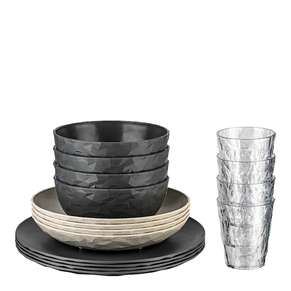 Gör dig redo för utomhusmåltider med stil med Club Göteborg-servis från Koziol. Setet innehåller 16 delar i en elegant färgkombination av mörkgrått och beige, och är perfekt för både campingälskare och glampingfantaster. Tallrikar, skålar och muggar har en modern fasettdesign som både tilltalar ögat och ger ett bra grepp.