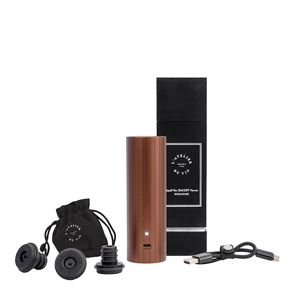Signature Gard’Vin ON/OFF Power elektrisk vakuumpump från L’Atelier du Vin är ett förstklassigt verktyg för att bevara vin efter öppning. Denna eleganta vakuumpump i druvfärgad gjuten aluminium med en raffinerad räfflad design aktiveras automatiskt när den placeras på flaskan och suger ut luften utan behov av manuell ansträngning. Resultatet är en hermetisk försegling som förhindrar oxidation och förlänger vinets hållbarhet till nästa smakupplevelse.