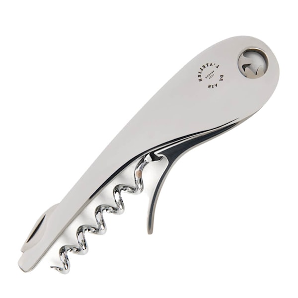 Korkskruven har ett stilrent uttryck i spegelblankt stål och är utrustad med folieskärare som gör hanteringen komplett.