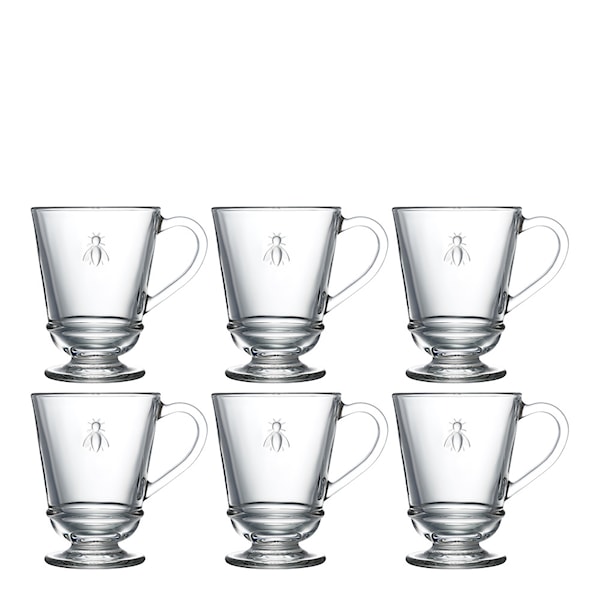 Sett med 6 glas på 28 cl med handtag, från Abeille-serien av det franska företaget La Rochere. Glasen är dekorerade med Napoleon-bin och passar perfekt till morgonkaffet!