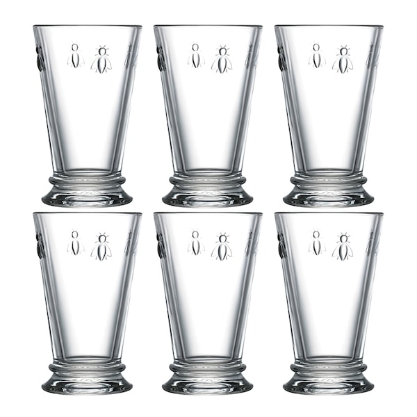 Longdrinkglas Abeille i 6-pack från det franska varumärket La Rochère. Dessa glas är vackert dekorerade med motiv av napoleonbin och är idealiska för en mängd olika drycker, inklusive drinkar, lemonad och iste. Varje glas har en kapacitet på 31 cl.