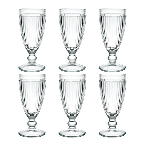 Dessertskål Antillaise, 29 cl, i en förpackning om 6 stycken, från det franska företaget La Rochére. Dessa klassiska och robusta dessertskålar får ett elegant uttryck med sin korta fot och höga, räfflade kupa. De är perfekta för servering av desserter, milkshakes, kaffedrinkar, glass och vispgrädde.