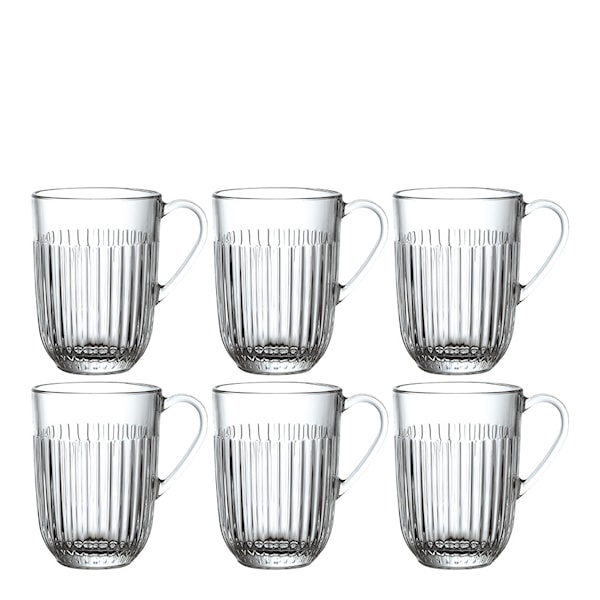 Koppar med handtag från Ouessant-serien, ett set om 6 stycken från det franska varumärket La Rochère, erbjuder en elegant men ändå enkel känsla med sina ribbade detaljer och praktiska öron. Med en kapacitet på 36 cl är de perfekta för varma morgondrycker och kaffedrinkar.