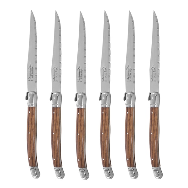 Grillknivarna från från Premium Line of Laguiole Style de Vie levereras i set om sex och har ett klassiskt uttryck med handtag som ger en elegant och rustik look. De tandade bladen är tillverkade i rostfritt stål med en tjocklek på 1,8 mm, vilket gör dem effektiva och stabila vid skärning av kött.