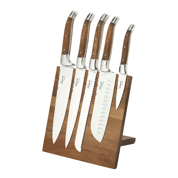Ett funktionellt knivset från Laguiole by Hâws med fem knivar och ett magnetiskt knivblock i olivträ. Knivarna följer den karakteristiska Laguiole-stilen, känd från en fransk by med lång tradition av kvalitetsknivar.