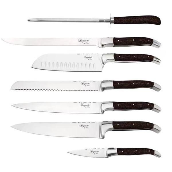 Bladen är tillverkade i 420 rostfritt stål och märkta med logotyp, medan handtagen i wengéträ ger ett stabilt och balanserat grepp. Setet innehåller örtkniv, santokukniv, skärkniv, kockkniv, brödkniv och skinkkniv, samt en brynstav för underhåll.