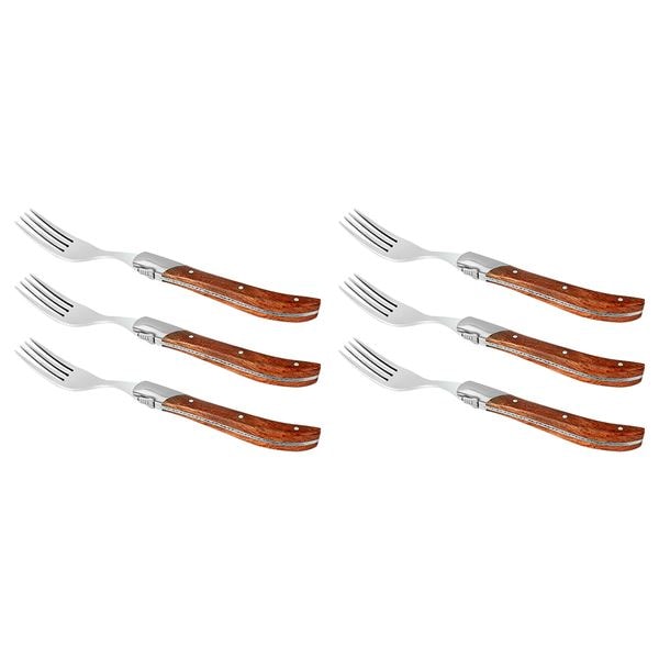 Laguiole by Hâws presenterar ett elegant set med sex stekgafflar i rosenträ. Gafflarna är tillverkade i 420 rostfritt stål och följer den välkända Laguiole-stilen, som har sitt ursprung i en fransk by. Varje gaffel är märkt med logotyp, och handtagen i rosenträ ger en varm och klassisk karaktär.