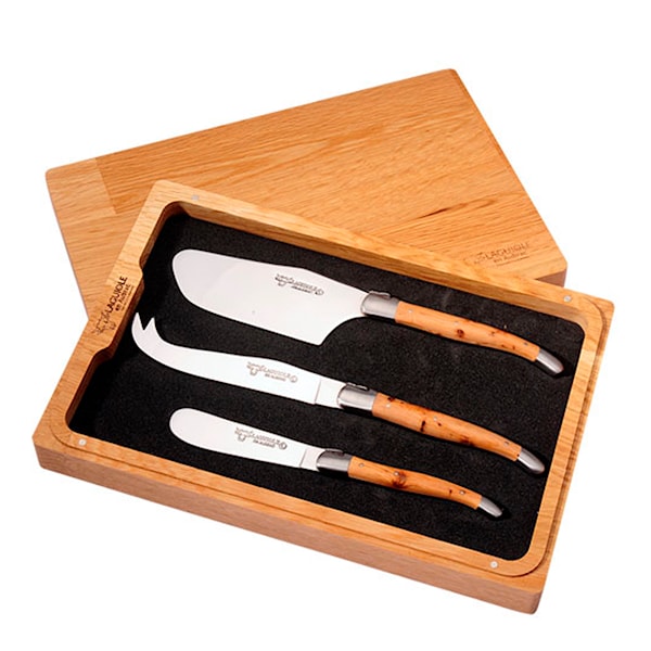 Exklusivt set med handgjorda ostknivar i tre delar med handtag i enträ och blad i rostfritt stål från franska Laguiole en Aubrac.