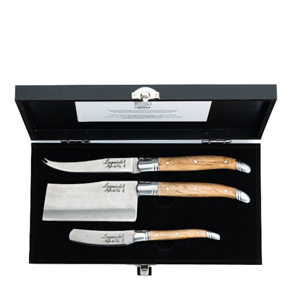 Detta ostknivset från Laguiole Style de Vie kombinerar funktionalitet med ett lyxigt uttryck. Med handtag i vackert olivträ och kraftiga blad på 2,5 mm ger setet en solid och exklusiv känsla vid ostbordet.