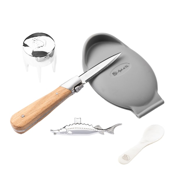 Laguiole Style de Vie presenterar ett elegant gåvoset i fem delar – perfekt för dig som uppskattar det lilla extra. Ostronsetet innehåller allt du behöver för att njuta av havets och lyxens delikatesser: en champagneöppnare, en kaviarsked av snäckskal, en öppnare för kaviarburkar, en ostronkniv och en silikonhållare som ger ett säkert och bekvämt grepp.