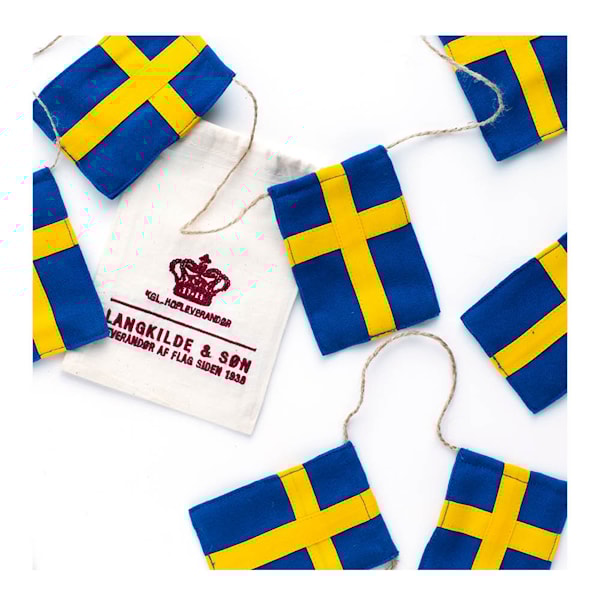 Flaggspel med svenska flaggor 10 cm från Langkilde & Søn. Skapa en festlig atmosfär med ett vackert flaggspel i högsta kvalitet. 10 svenska flaggor sydda i äkta flaggduk och fastsatta på segelgarn.