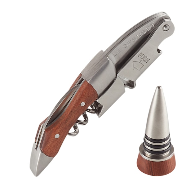 Le Creusets korkskruvset med förslutare GS-190/WT110 kombinerar både praktisk funktion och estetisk skönhet, vilket gör det till en perfekt gåva till den som älskar vin. När du öppnar förpackningen möts du av en elegant korkskruv tillverkad i rosenträ, tillsammans med en matchande förslutare. Korkskruvens tvåstegssystem gör det enkelt att dra ut korken, medan den medföljande kniven effektivt tar bort folien från flaskan.