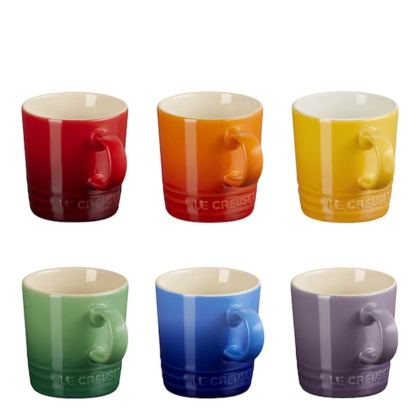 Rainbow espressomuggar från Le Creuset är ett glatt set med sex koppar à 10 cl i regnbågens färger. Muggarna är tillverkade av slitstarkt stengods och tål temperaturer upp till 260 °C. De fungerar lika bra till espresso som till små förrätter eller desserter.