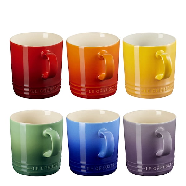 Le Creusets Rainbow muggar 35 cl är ett färgstarkt set med sex rejäla muggar som passar både till frukostkaffet och eftermiddagsteet. Muggarna är tillverkade i värmebevarande stengods och tål temperaturer upp till 260 °C. De kan användas i mikro, ugn, grill, kyl, frys och diskmaskin. Den emaljerade ytan är både tålig och lätt att rengöra.