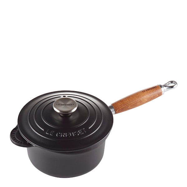 Kastrull av gjutjärn med trähandtag i den klassiska Le Creuset looken. Fördelen med ett trähandtag är att det inte blir varmt trots att gjutjärnet håller värmen mycket väl. Locket har ett ventilationssystem för att förhindra att det kokar över. Och två nätta hällpipar säkerställer droppfri servering.
