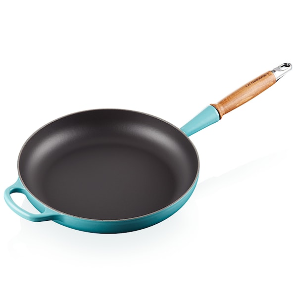Emaljen utvecklar en naturlig patina som förbättrar pannans stekegenskaper med tiden. Det ergonomiska trähantaget ger ett stabilt grepp, och hjälphandtaget underlättar vid servering. Pannan passar alla typer av spisar, även induktion, men ska inte användas i ugn.