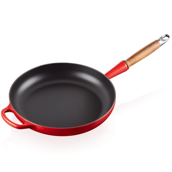 Emaljen utvecklar en naturlig patina som förbättrar pannans stekegenskaper med tiden. Det ergonomiska trähantaget ger ett stabilt grepp, och hjälphandtaget underlättar vid servering. Pannan passar alla typer av spisar, även induktion, men ska inte användas i ugn.
