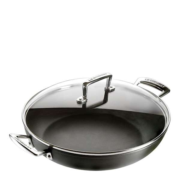 Toughened Non-Stick Traktörgryta med glaslock 28 cm Rund traktörpanna från Le Creuset och serien Toughened. Grytan levereras med ett glaslock som bevarar fukt och smak för bästa möjliga resultat. Locket är värmebeständigt vilket gör att du kan kontrollera maten utan att behöva lyfta på det och störa tillagningsprocessen. Rejäla handtag på sidorna med Le Creusets logga - både praktiskt och snyggt.