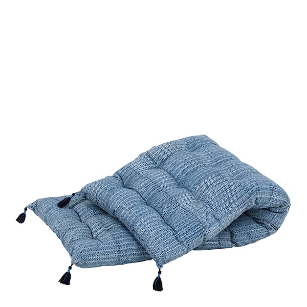Sittdyna med tofsar från Chamois. Mönstret är tryckt med indisk blockteknik, en traditionell hantverksmetod där varje del av mönstret trycks för hand. Det skapar en unik look, och ger duken ett levande och spännande uttryck.