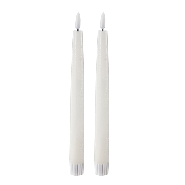 Dessa LED-kronljus från Edelweiss mäter 2,2 x 22 cm och levereras i ett 2-pack. Ljusen har en naturligt fladdrande låga och en vaxad yta som ger ett övertygande, verklighetstroget intryck. Tack vare den räfflade, konformade gummibasen passar de bra i vanliga ljusstakar.