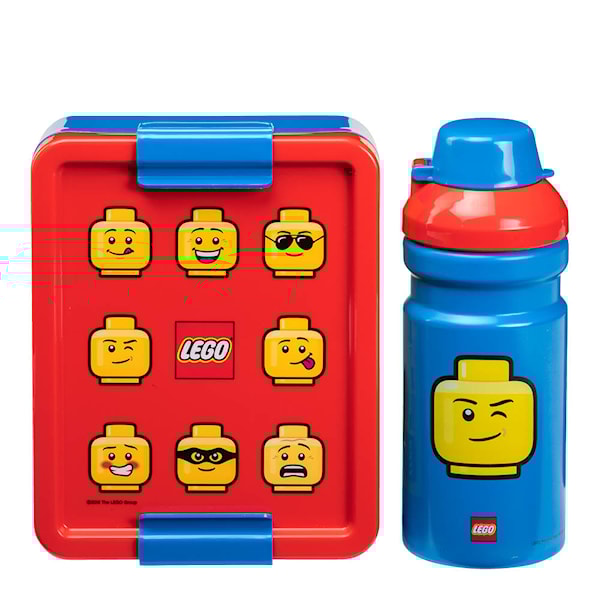 Lunchbox Set Ikonisk från Lego innehåller en lunchlåda och en flaska med lego tryck. Lunchlådan har flyttbara avdelare som man enkelt kan hålla smörgåsar, frukt, grönsaker åtskilda och flaskans munstycke försluts med ett lock.
