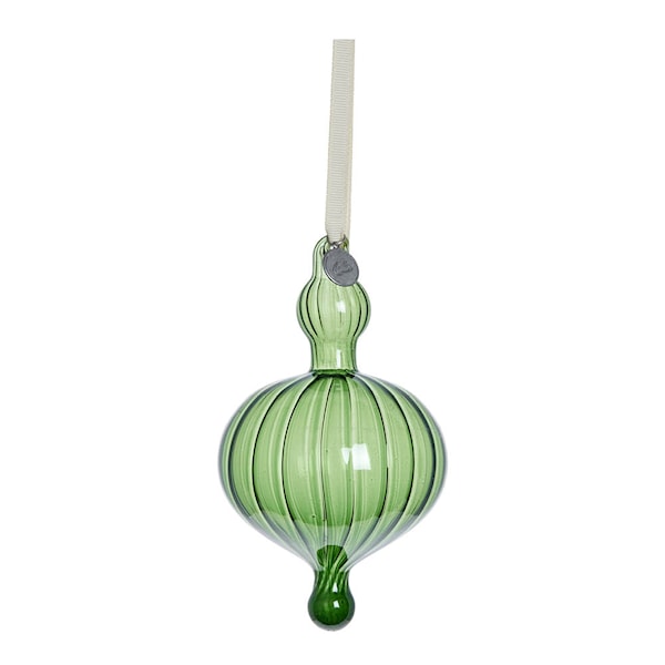 Den djupa gröna färgen ger ett klassiskt uttryck, medan den blanka glasytan reflekterar ljuset på ett vackert och dämpat sätt. Formen är smal och sofistikerad, vilket gör att den utmärker sig och skapar visuell rörelse i granen.