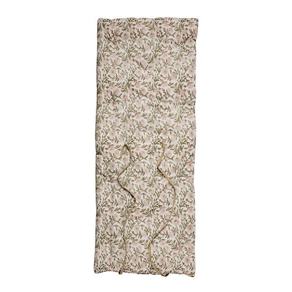 Ivy stolsdyna/madrass 180x70 cm i dämpad grön från Lene Bjerre förenar hantverkskänsla med praktisk komfort. Ena sidan har ett blocktryckt mönster med konstnärlig karaktär, den andra är enfärgad för ett lugnt uttryck.