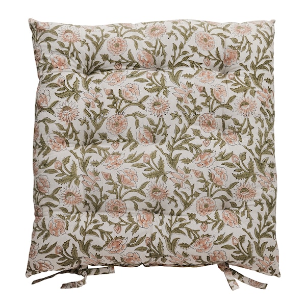 Ivy stolsdyna i dämpad grön från Lene Bjerre förenar vackert hantverk med funktionell komfort. Med ett blocktryckt motiv på ena sidan och en stilren enfärgad baksida skapar den ett balanserat uttryck.