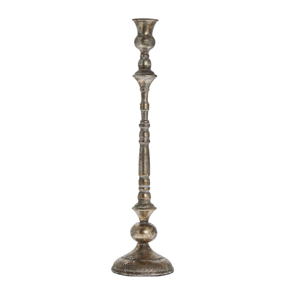 Tillverkad i järn med en antiksilverfärgad finish har ljusstaken en vacker struktur och diskret glans som framhäver dess form. Höjden gör den till ett elegant blickfång – lika vacker på matbordet som på en byrå eller i fönstret där den sprider ett varmt ljus.
