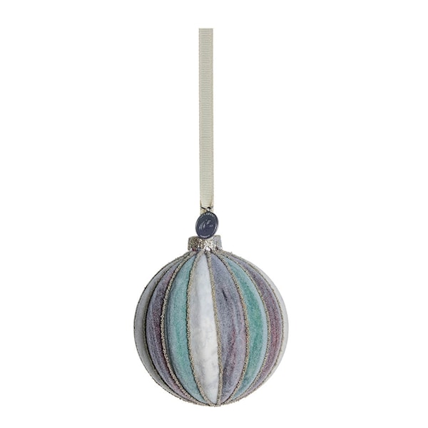 Nomillia julkula 8 cm från Lene Bjerre är en vacker handgjord glaskula med ett elegant randigt mönster. Den är munblåst och handmålad, vilket gör varje dekoration unik.