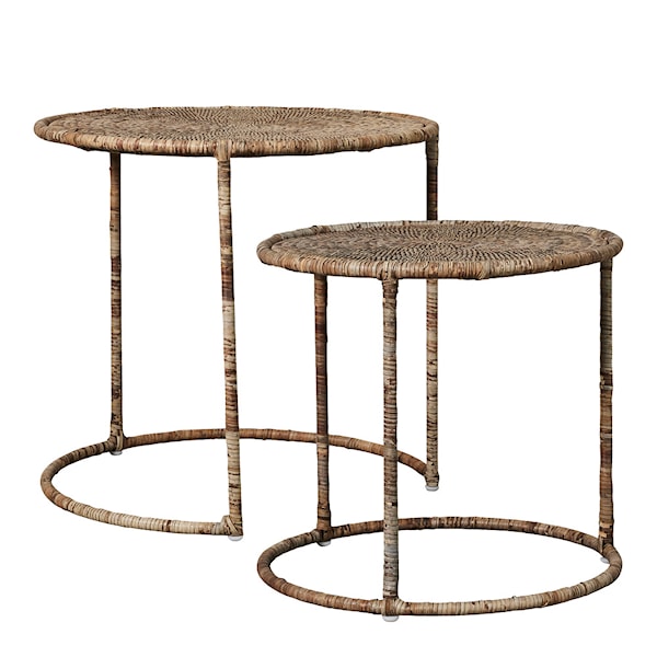 Norah sidobord i två delar, med måtten 56x60 cm, från Lene Bjerre är handvävda och tillverkade av högkvalitativ rotting i Norah-serien. Denna serie präglas av användningen av naturliga material såsom bambu och rotting, vilka är snabbväxande växter som är enkla att odla och ger starka material för heminredning.