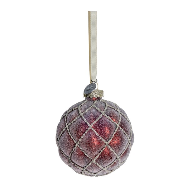 Norille juldekoration från Lene Bjerre är en vacker glaskula i mörkröd nyans, munblåst och handdekorerad. Med sina mått på 8x8x8 cm är den ett elegant tillskott till julgranen och skänker både värme och djup.