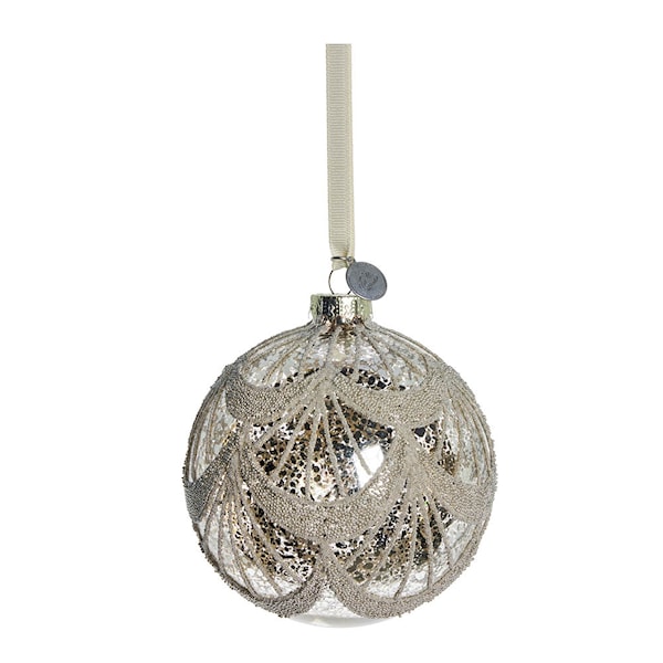 Perline julkula 10 cm antiksilver från Lene Bjerre är en elegant glaskula med vackra, handgjorda detaljer och subtil glans.