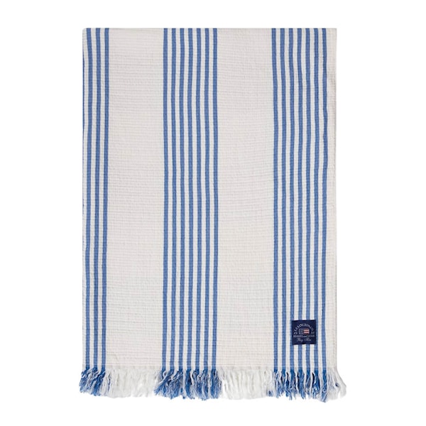 Lexington bomullspläd 170x130 cm i vitt, blått och beige är en mjuk och lätt pläd med ett levande textiluttryck. Den garnfärgade jacquardväven skapar struktur och variation, där framsidan pryds av ränder medan baksidan har ett diskret rutmönster som ger djup.