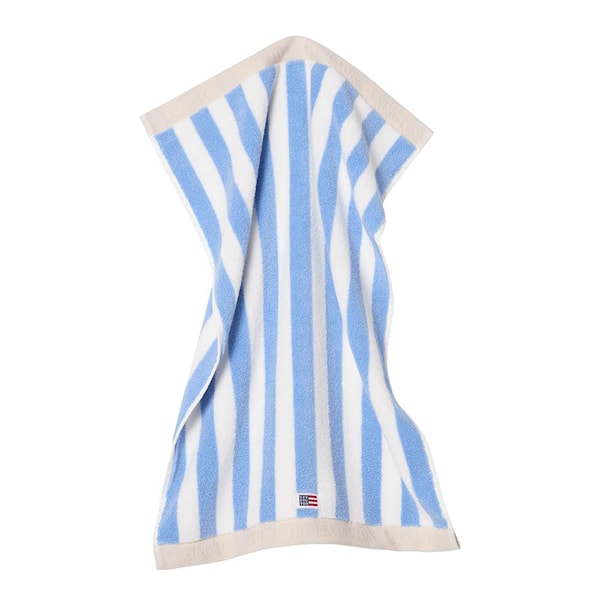 Lexington Block Striped handduk 70x130 cm i himmelsblått, vitt och moonbeam ger badrummet en klassisk kustkänsla med sin tidlösa blockrandiga design. Handduken är tillverkad i 600g ringspunnen bomullsfrotté av 100% bomull, vilket ger en fyllig och mjuk känsla mot huden samtidigt som den har mycket hög absorptionsförmåga. Den vikta kontrastkanten med jacquardvävd textlogotyp ger en genomarbetad och elegant finish, medan den vävda Lexington-logotypen framtill förstärker det välkända uttrycket.