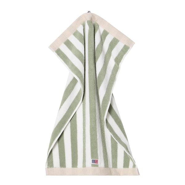 Lexington Block Striped handduk 70x130 cm i vintagegrön, vit och moonbeam är en badhandduk där material, funktion och design samverkar. Den är tillverkad av 100% ringspunnen bomull med en vikt på 600g, vilket ger en tät, absorberande och slitstark kvalitet. Den blockrandiga designen tillsammans med kontrastkanter och jacquardvävd logotyp både upptill och nedtill skapar ett tydligt och balanserat uttryck.