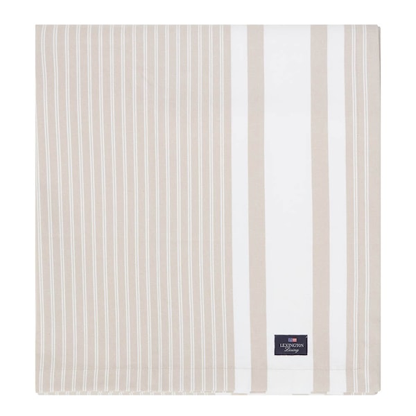 Randig duk från Lexington, 180x180 cm, i beige och vitt. Oxfordtyget ger ett klassiskt uttryck, och engelska hörn tillsammans med Lexingtonetiketten skapar en stilren helhet.