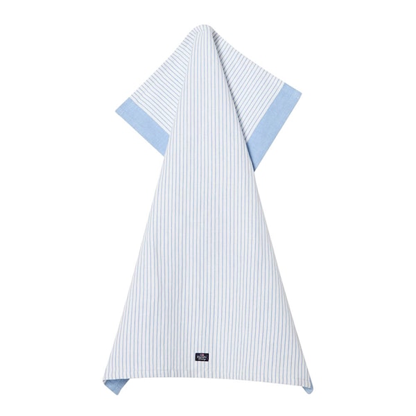 Lexington randig kökshandduk i linne/bomull 50x70 cm i blått och vitt ger köket en klassisk och fräsch känsla med sina tidlösa ränder. Handduken är tillverkad i en blandning av 55% linne och 45% bomull, vilket kombinerar linnets naturliga mjukhet med bomullens slitstyrka. De garnfärgade ränderna skapar ett rent och genomarbetat uttryck, medan den vävda Lexington-logotypen på framsidan tillför en autentisk detalj.