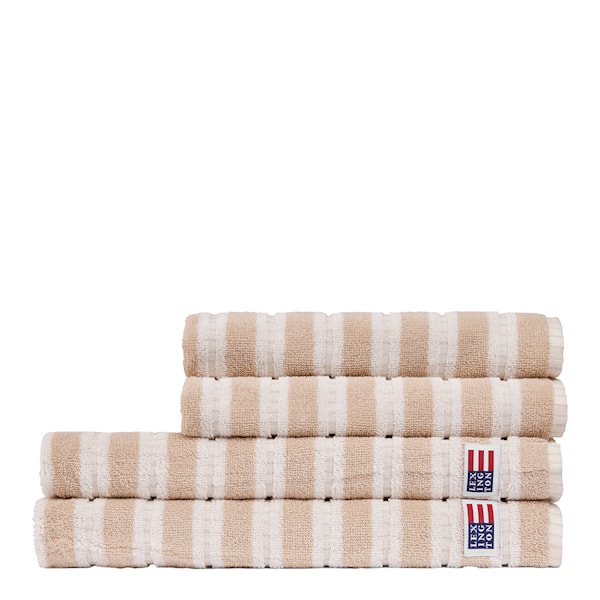 Randigt frottéhandduk från Lexington tillför badrummet en känsla av tidlös lyx. I en ljusbeige och offwhite färgkombination är handduken tillverkad i 500 g/m² ringspunnen bomull, vilket ger optimal uppsugningsförmåga och långvarig mjukhet – även efter upprepad tvätt.
