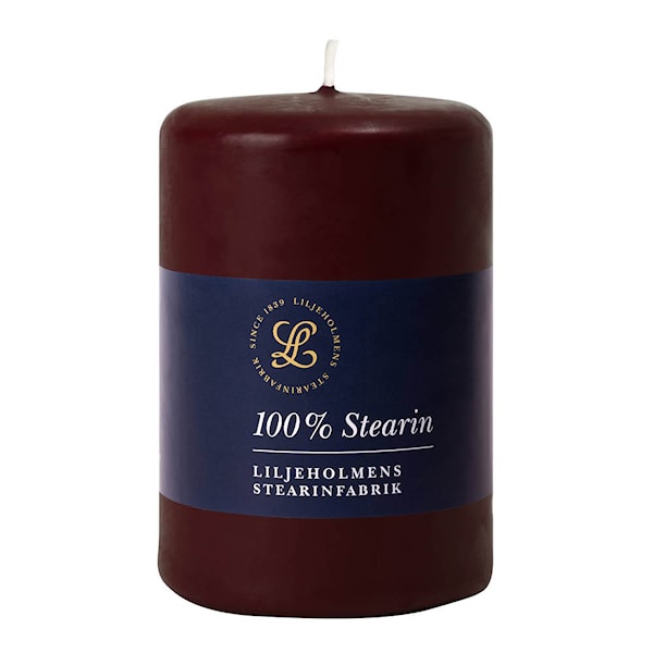 Liljeholmens blockljus i vinrött är tillverkat i 100 % stearin och ger ett varmt, vackert sken i hemmet. Passar lika bra i en större lykta som direkt på ett fat.