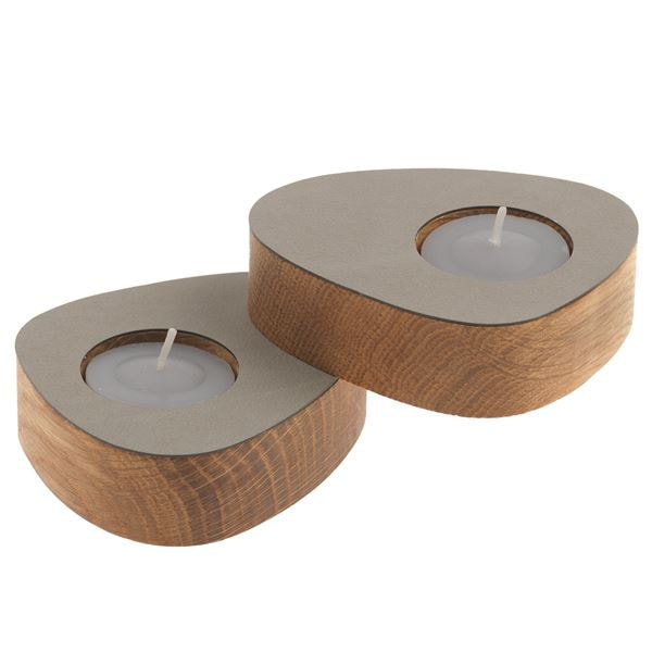 LIND DNA CURVE TEALIGHT HOLDER är en stilren och handgjord ljushållare för värmeljus, tillverkad av ek och OEKO-TEX®-certifierat återvunnet läder. En dold magnet i träet gör det möjligt att arrangera ljushållarna på olika sätt efter din personliga stil. Med sina mått på H8, B10, L5,6 cm och i en ljusgrå nyans, är den en elegant detalj för alla hem.