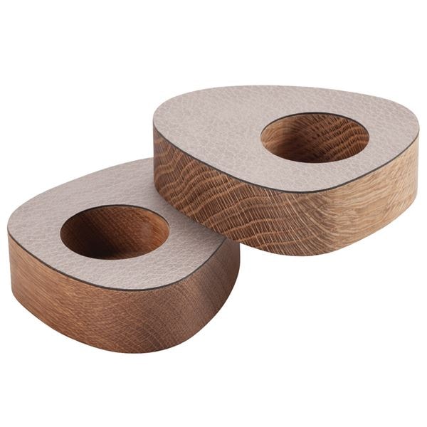 LIND DNA CURVE TEALIGHT HOLDER är en stilren och handgjord ljushållare för värmeljus, tillverkad av ek och OEKO-TEX®-certifierat återvunnet läder. En dold magnet i träet gör det möjligt att arrangera ljushållarna på olika sätt efter din personliga stil. Med sina mått på H8, B10, L5,6 cm och i en ljusgrå nyans, är den en elegant detalj för alla hem.