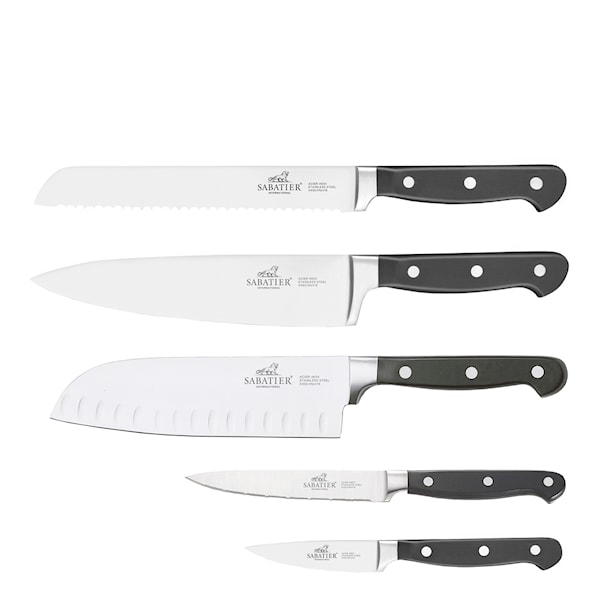 Knivset i 5 delar från Lion Sabatier. I setet ingår kockkniv, santokukniv, brödkniv, tomatkniv och örtkniv från den klassiska knivserien Pluton. Knivarna är tåliga och mycket resistenta mot rost. Denna knivserie karaktäriseras av supervassa knivar med optimal vikt och balans som ligger skönt i handen.