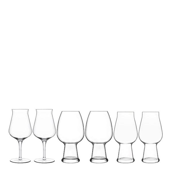 Ölglas-set med tre olika sorters glas från Luigi Bormiolis serie Birrateque. I setet ingår glas för veteöl, ale och ett allroundglas. Setet innehåller 2 glas av varje sort. Glasen är tillverkade av blyfritt krystalinglas och tål maskindisk upp till 55°C.